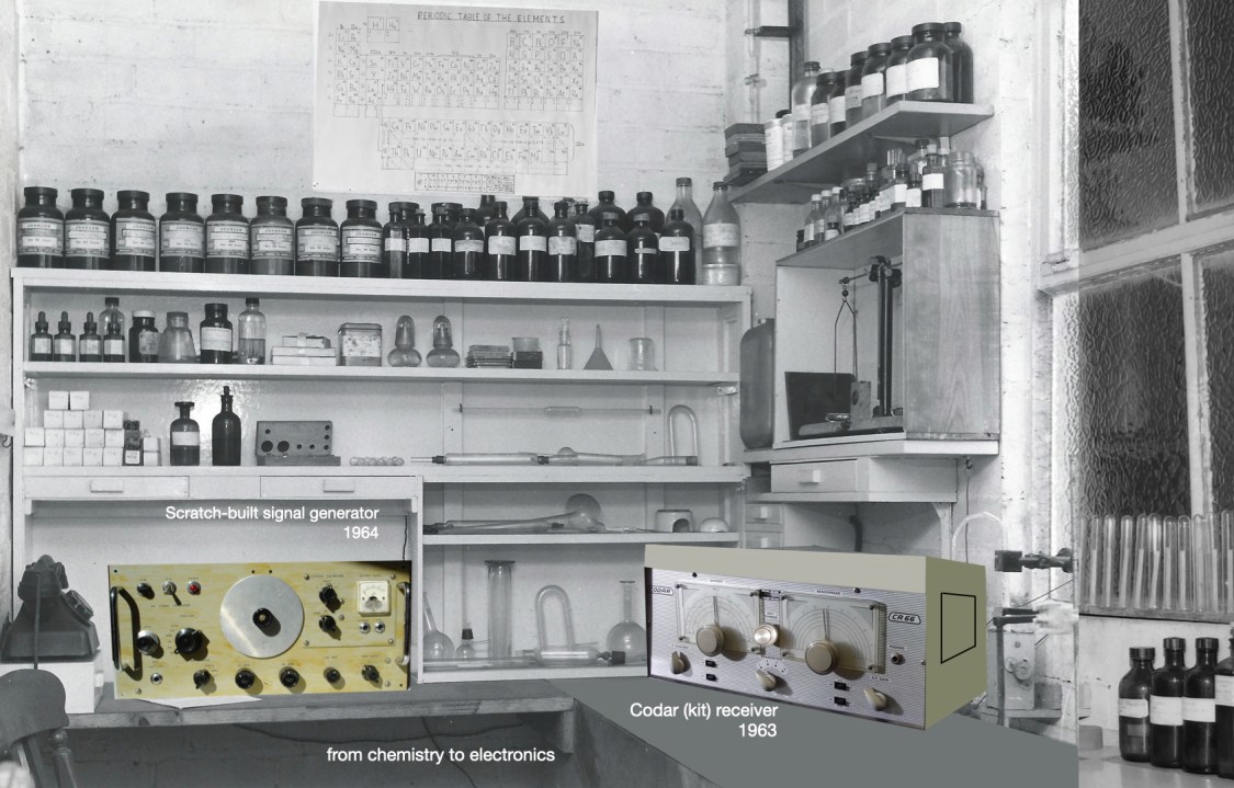 From chemistry to electronics: crystal receivers followed by valve and transistor versions and “ham” radio kits from “Codar” led to electronic engineering studies and employment in the industry.