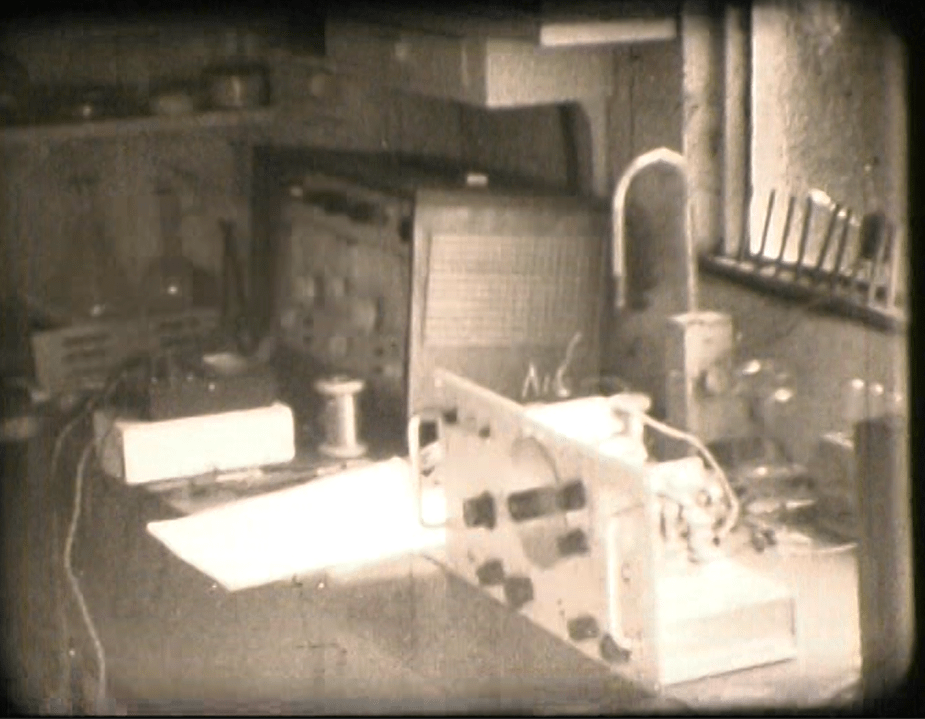 Here we see the Codar receiver barely visible on this black and white 8mm video film screenshot. The signal generator is more clearly recognizable in the foreground