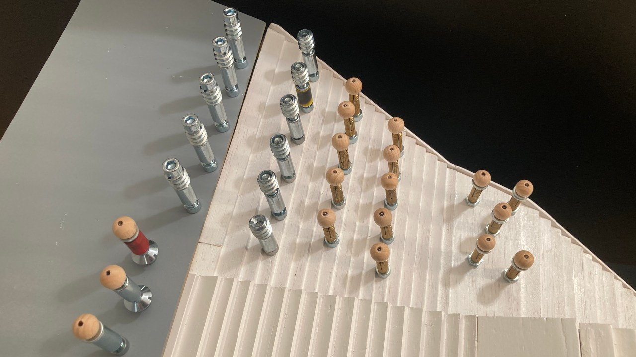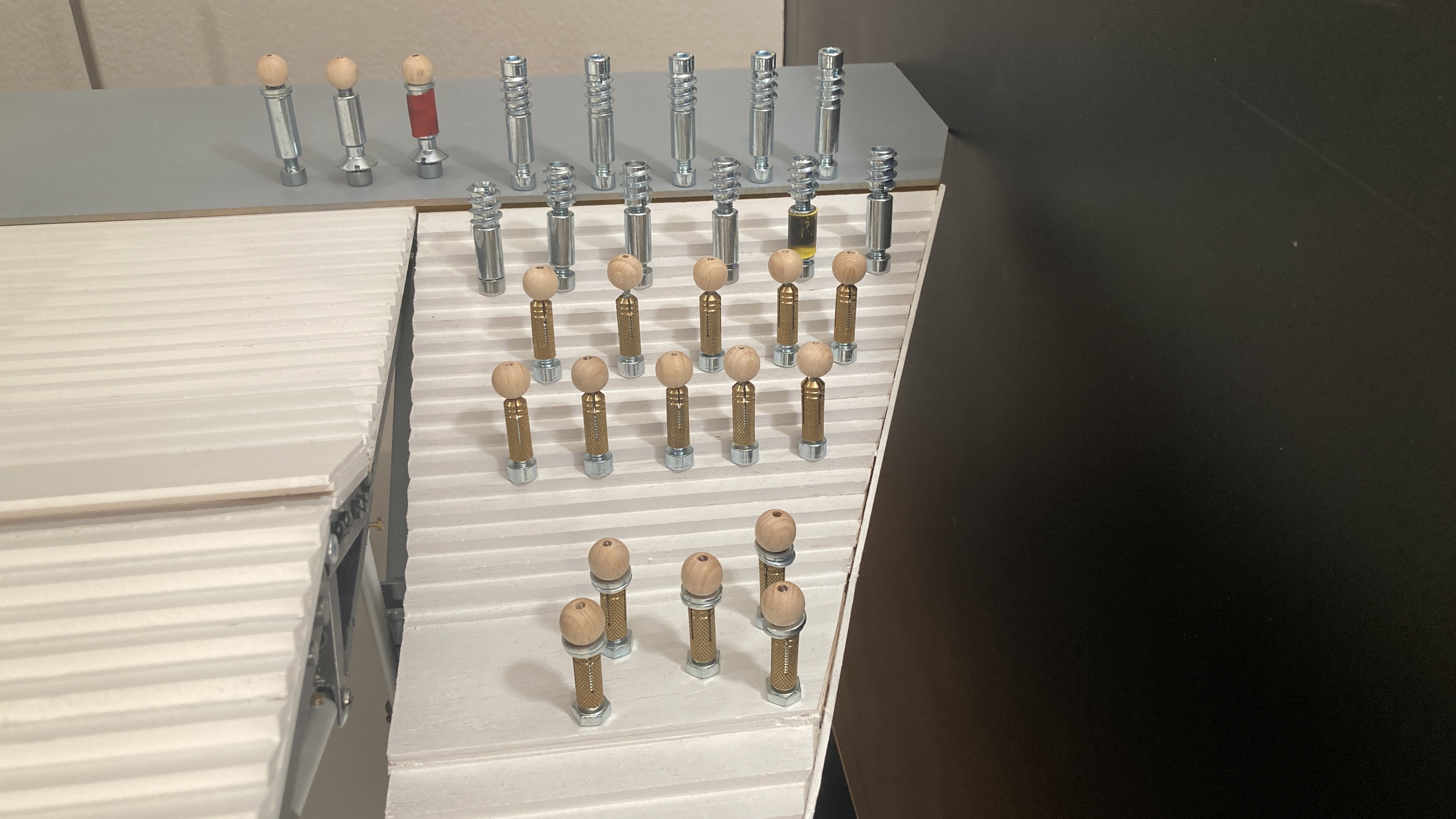 Experimenting has begun with finding suitable scale characters to populate the arena stages in performance. The style can be symbolic as can be seen here by some 6mm threaded trial versions; latest ones have a ‘head’ and a “footprint” which allows them to stand on the steps. Up until now the population has been uniquely taken from the chessboard. Santa Claus will not stay as he is slightly oversize in scale and being chocolate he will be eaten soon!