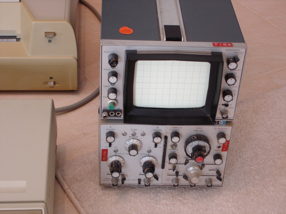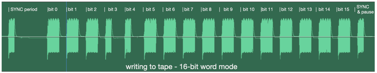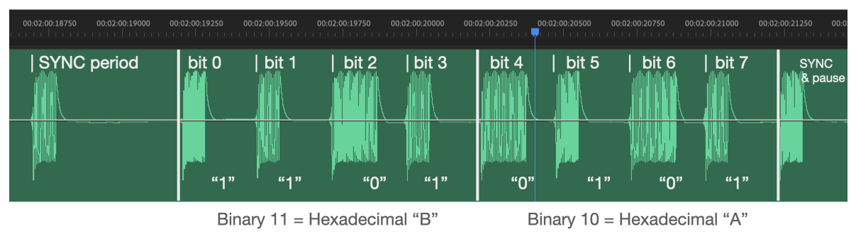 Zooming in we can make out the sync timing and 8-bits of information of each instruction – one byte instruction is ≈ 55ms. The oscillations are counted up against a down counter. Count greater than space equates as “zero”, and count less than space equates to a “one”. So just for fun we can even check the values visually, this example (bit zero first on the left) is 1101 0101 = Hex10, Hex11 = AB