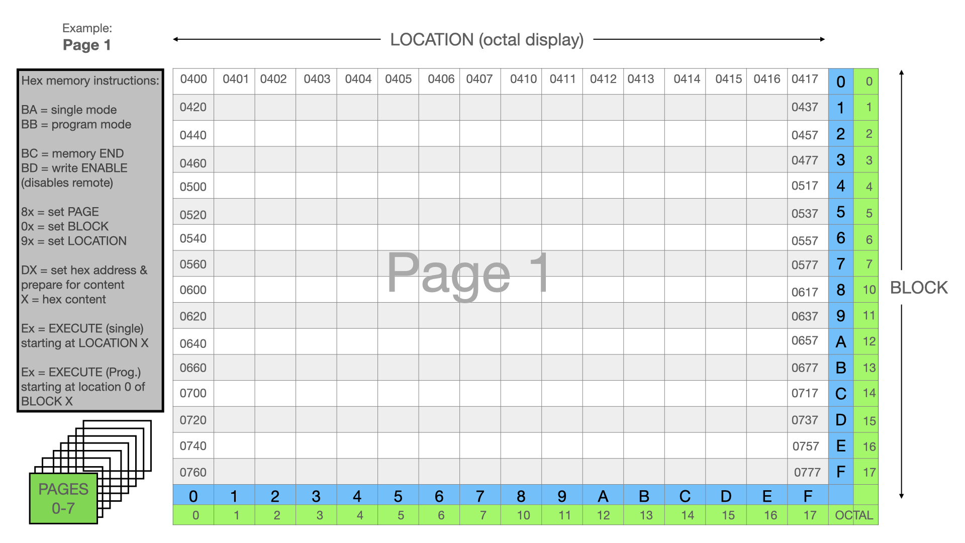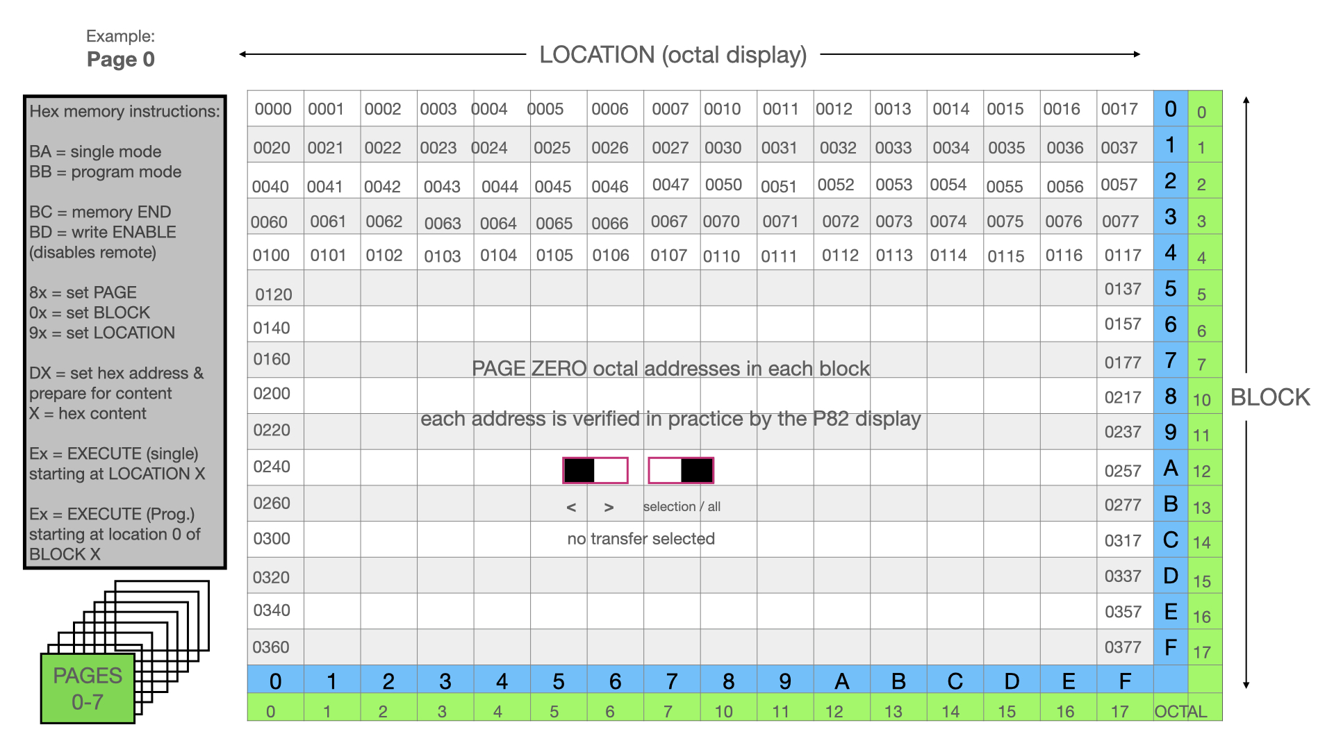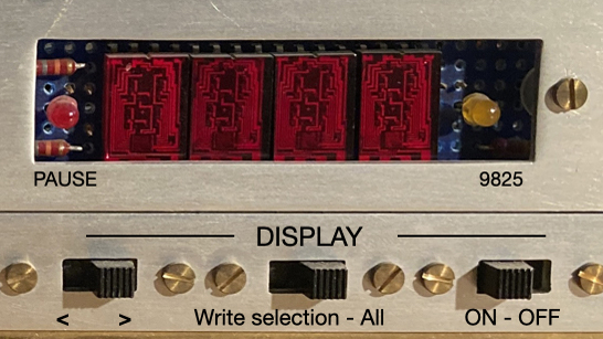 Originally this 16384-bit (2048x8bits) memory was loaded using the HP9825 or short sequences from the keyboard. Our current tests remain keyboard initiated, focusing on the independent, free-standing operation of the P82. The design defined memory access by 8 pages of 16 blocks by 16 locations. There are some quirks for manual operation in that the displayed addresses are in octal while the keyboard input is in hexadecimal – this took some time to sort out via experimentation and our logic diagrams which are fortunately very good!