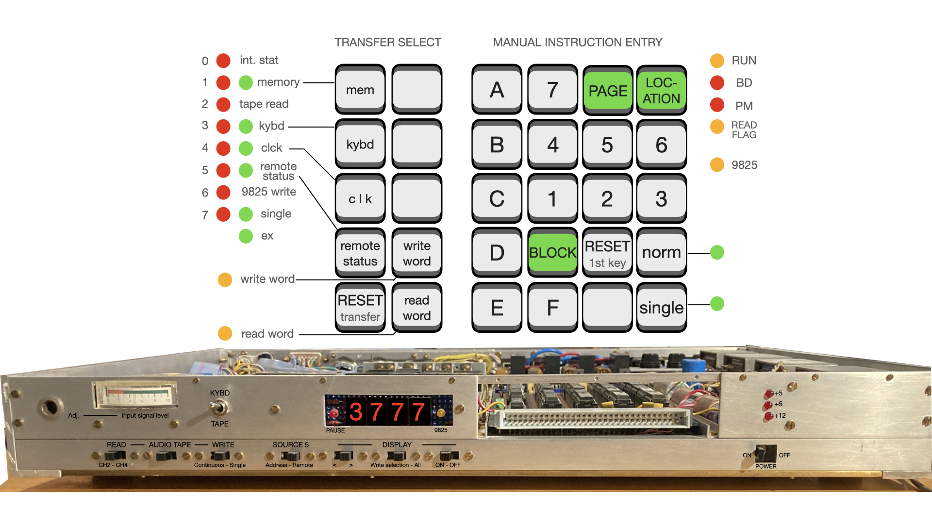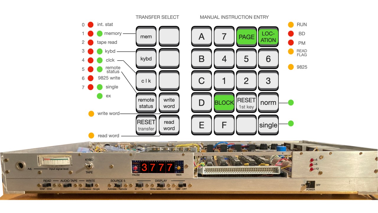 P82 keyboard instructions are all one byte (2 hexadecimal keys) and so writing in byte mode satisfies basic operation. However word mode (= double byte, 16 bits, or 4 hexadecimal digits) is required for the internal clock and for external date transfers and for use with the HP9825 — select the source we wish to write and “write word”. Byte and word modes should not be mixed.