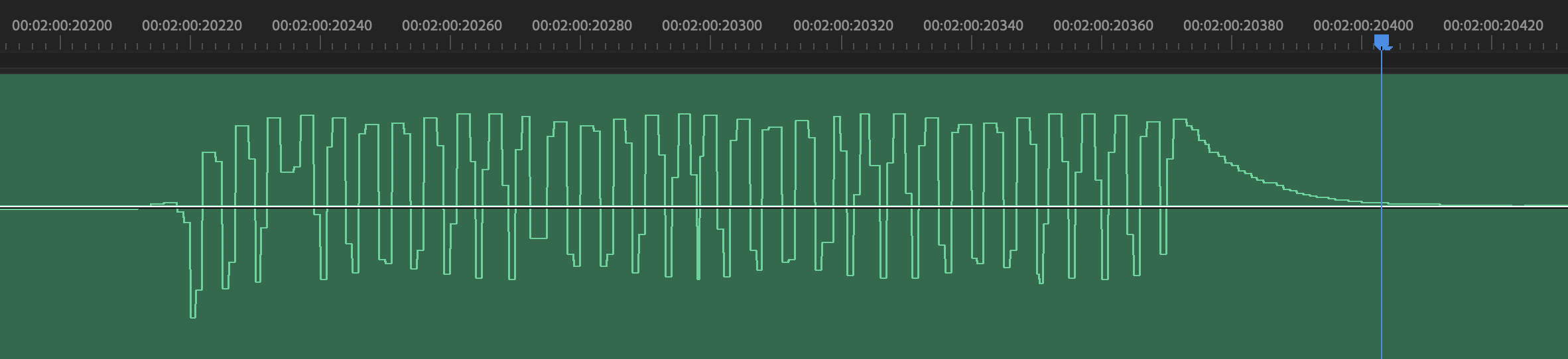 During construction in 1982 an oscilloscope was necessary to obtain such clarity; fortunately we had the HP 180A. Today Adobe Premiere does the job for us — display is set to time-units mode to see down to the individual cycle level of an audio waveform. Our waveform is using 48kHz, so there are 48000 time-units per second.