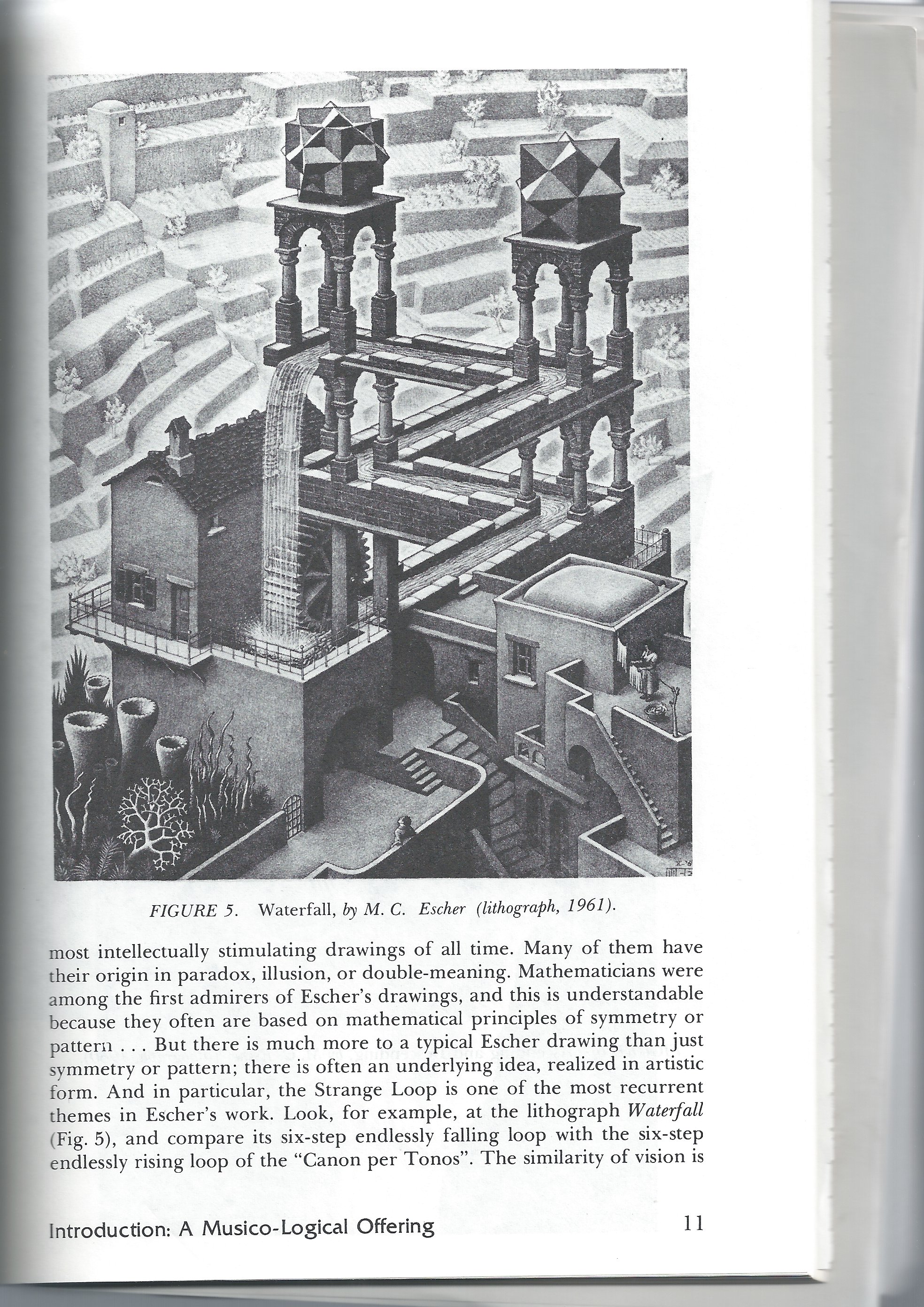 Quote from the article: “The book isn’t about how mathematics, music and art relate to each other, but about abstract structures that appear in all three. Hofstadter calls these structures strange loops: processes that appear to involve moving up though a hierarchy of levels but then, paradoxically, leave you where you started. MC Escher’s famous lithograph Ascending and descending is a great illustration of such a strange loop.”