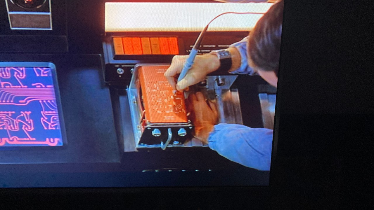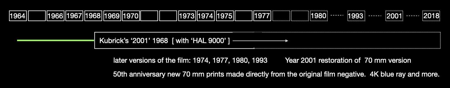 Kubrick already planning in 1964, began work on the film in 1965, the Odyssey was “launched” in April 1968. Moon-landing just one year later in July 1969. The special effects in the film ‘2001’ were incredibly well done considering that nothing existed of the technologies Kubrick succeeded in showing. Graphics pads and coloured video screens in the space craft were accurately depicted, yet rapid miniaturisation of electronics in general was not so well predicted – as witnessed by the fascinating scene where the computer HAL is slowly brought to its knees by unscrewing physical modules from the impressive bank inside its so-called “brain room” within the ‘Discovery1’ space ship. Similarly, a circuit module “AE35” which HAL determined had failed [so luring the astronauts into a space walk to repair it] had a very much late 60’s flavour construction style.