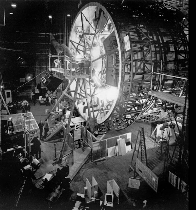 Simulated weightlessness along with the artificial gravity “centrifuge” of the space craft were all totally convincing. The amazing rotating set cost about $0.75 million out of the films total budget of $10 m. The wheel was about 12m in diameter and 6m wide constructed in the Borehamwood studios, England. The wheel was rotated by a motor positioned in a closed pit below the studio floor.