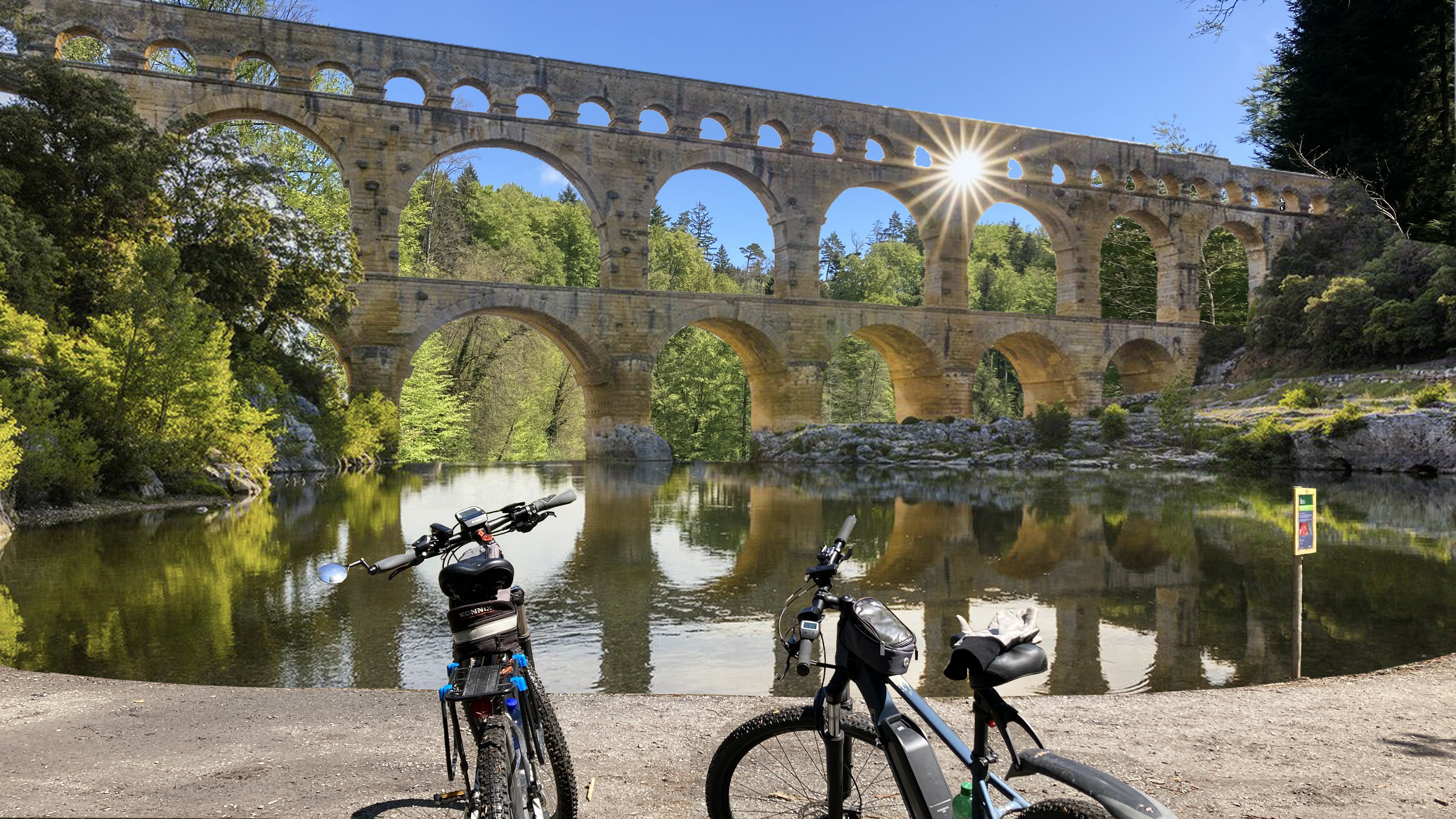 Photo art Gallery | Posted on 09/05/2023 by marcomathieumedia Blending photo scenes — Pont du Gard (tourist website) over forest lake plus over-laid bicycles Original forest lake photo Pont du Gard added introducing ‘Roman guards’ Those Romans are everywhere!