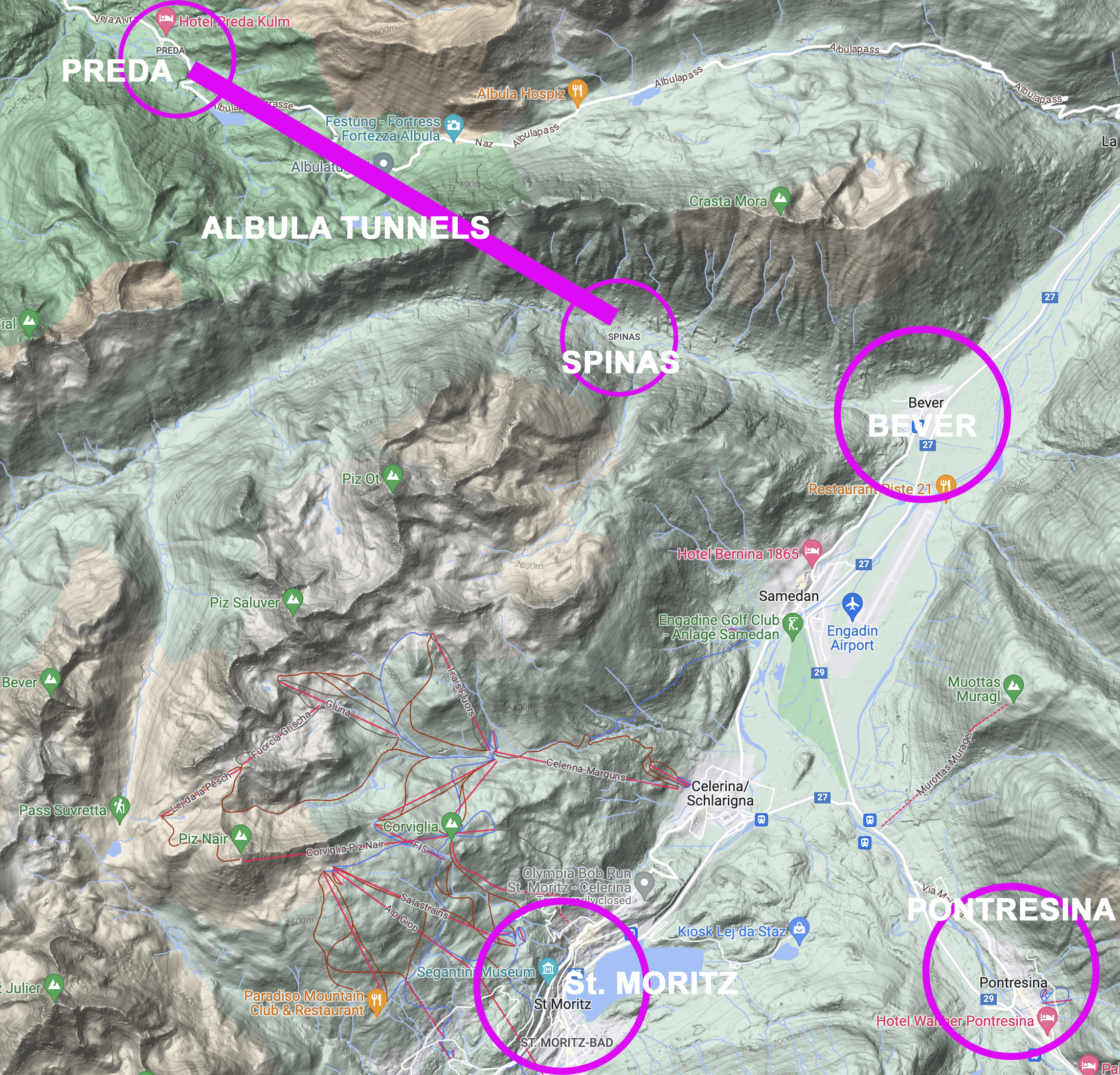Tunnel data from the Rhaetian railways project website. Map based on Google Maps.