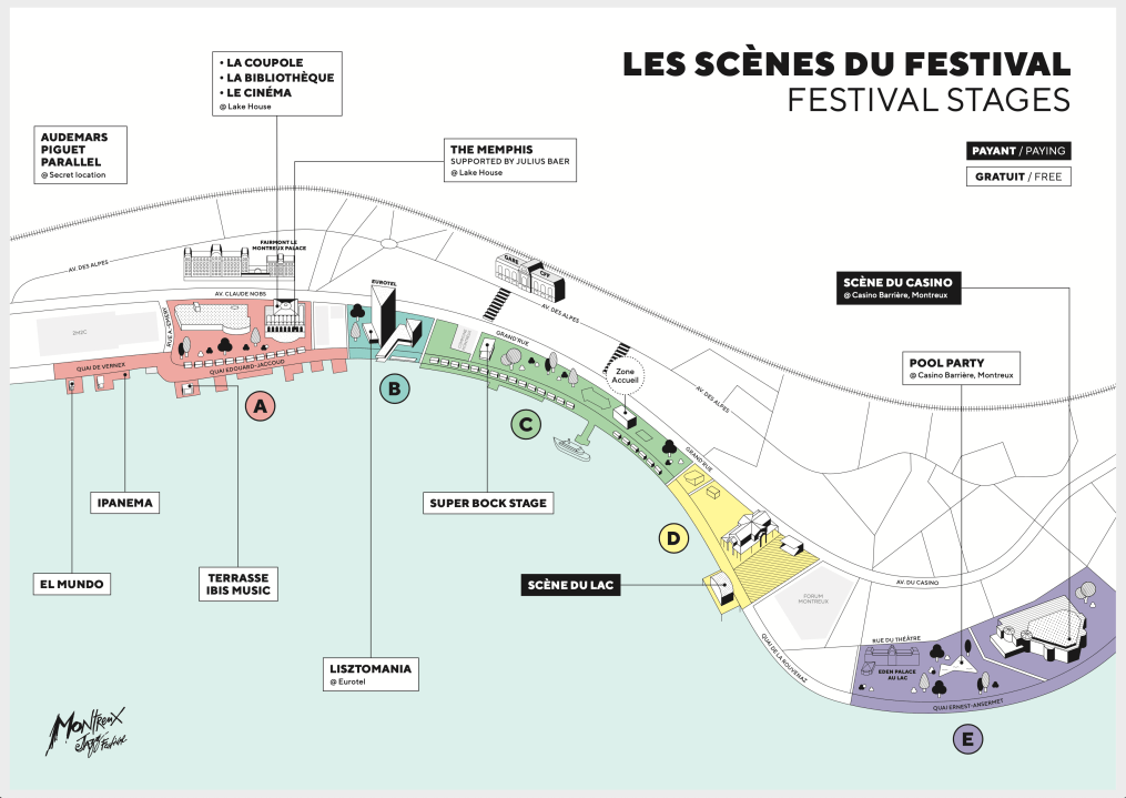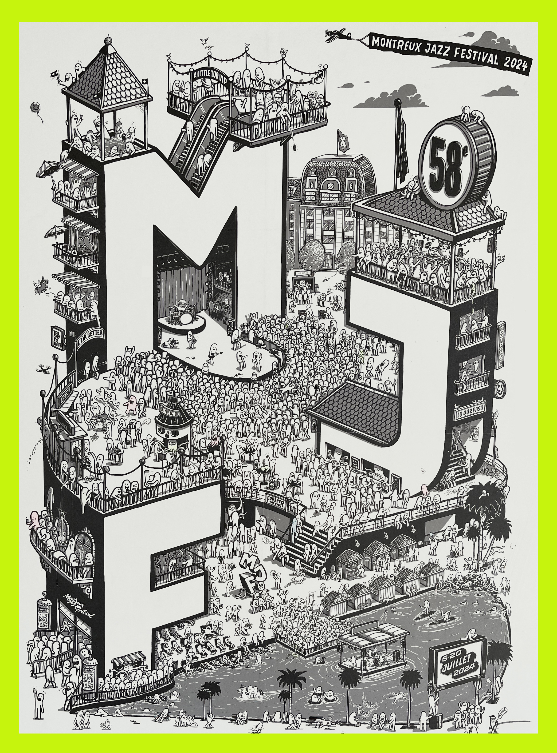 Playful and teeming with details, the street art poster by Geneva artist Rylsee captures the excitement of a wild night at the Montreux Jazz Festival, focusing on the festival goers and their stories.