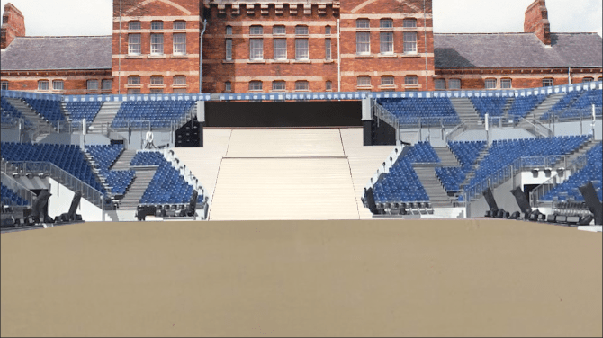 from under the raising staircase of the arena grand-stand