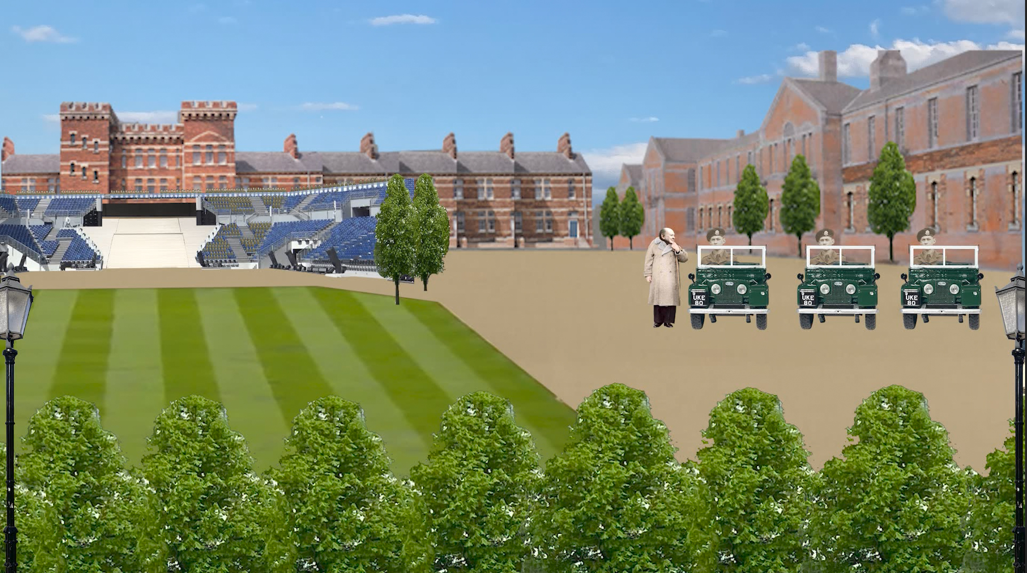We begin with a way to bring the great man to the barracks, followed by grand-stand seating installed on the parade ground . The scenes are populated with many cadet force clones for the celebration.