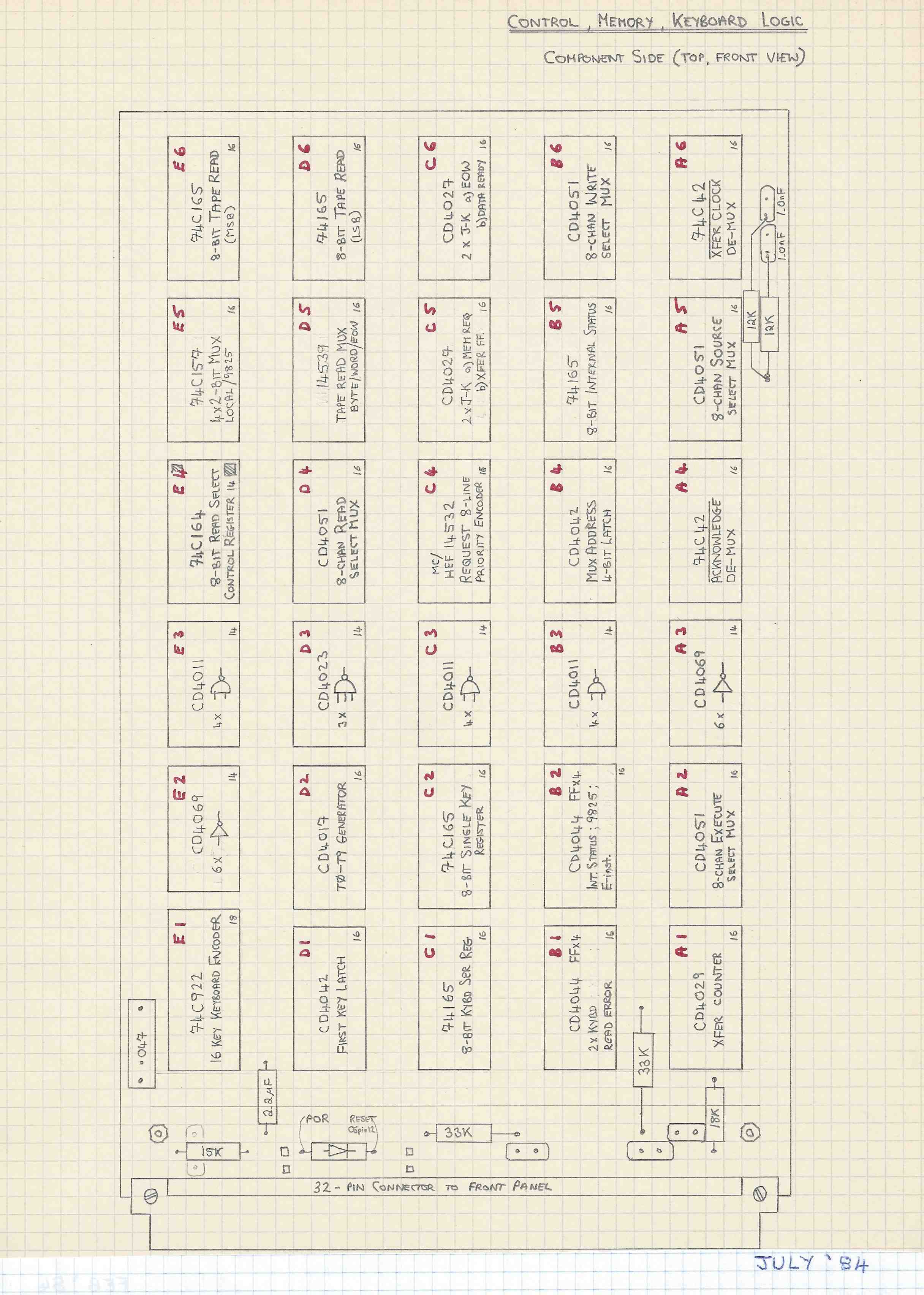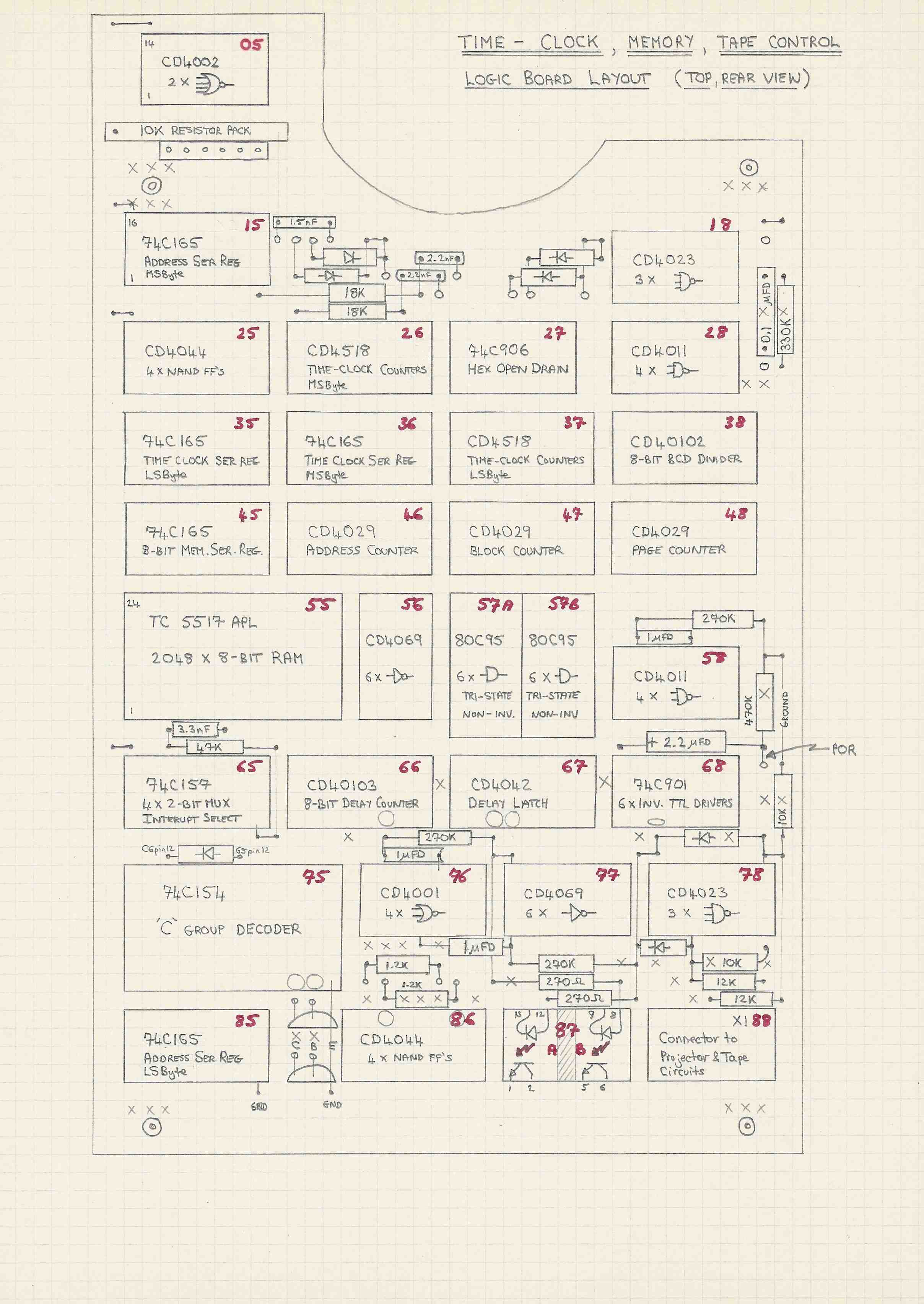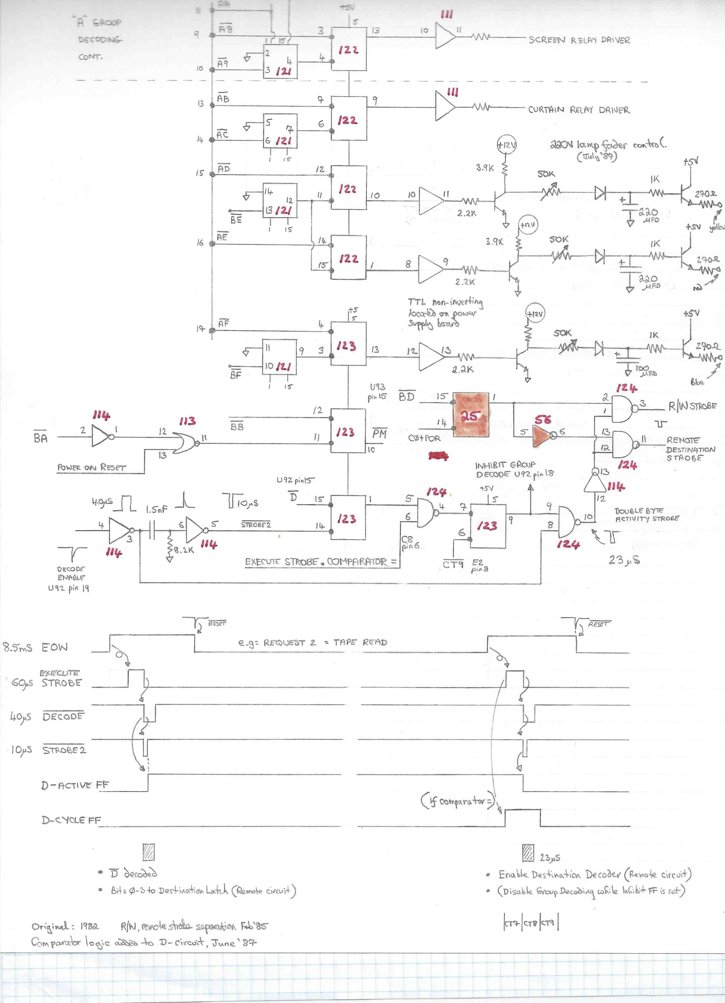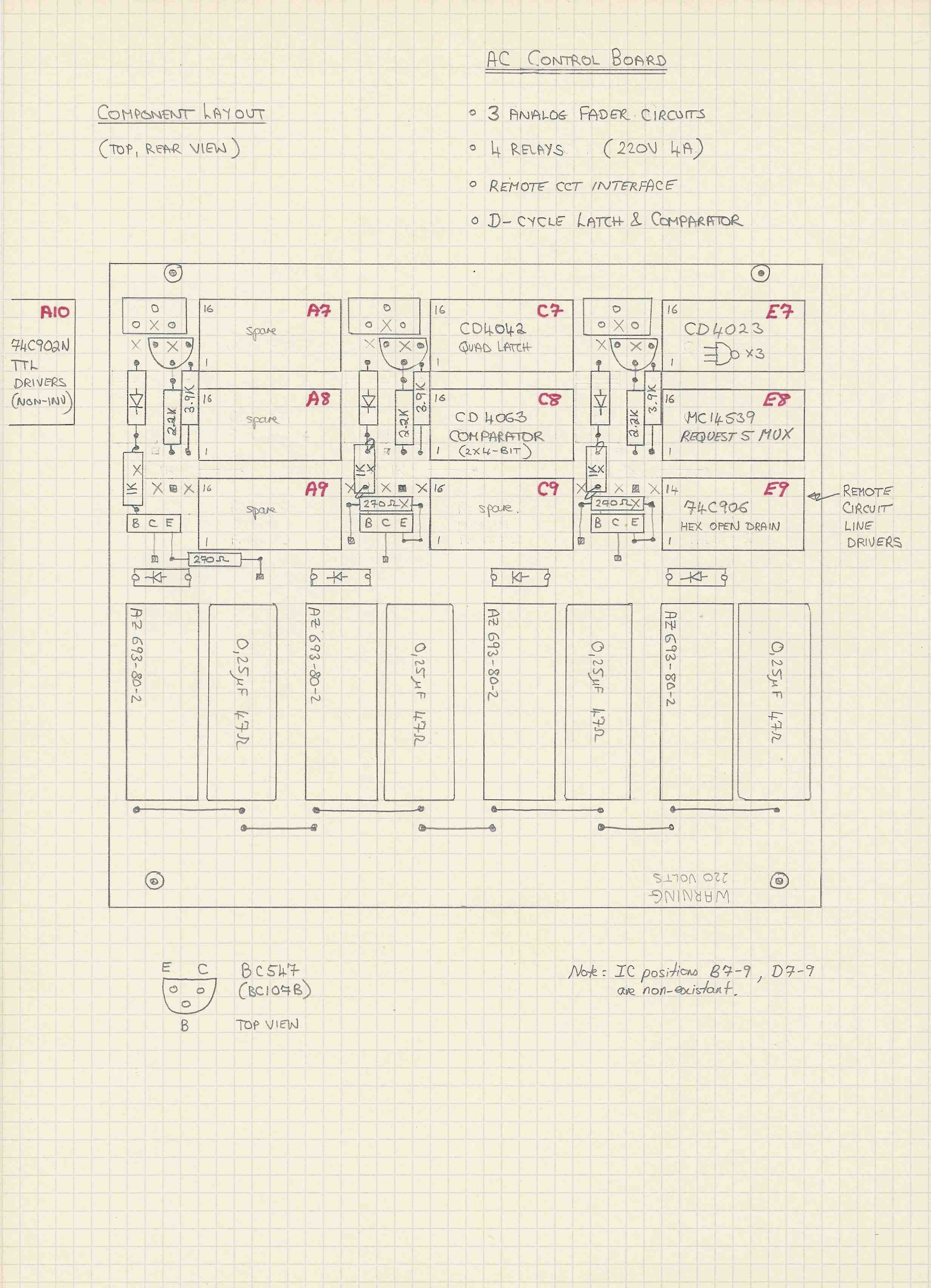 Detailed circuit diagrams and physical layout of components (central control unit) all hand-drawn between 1982 and 1987: