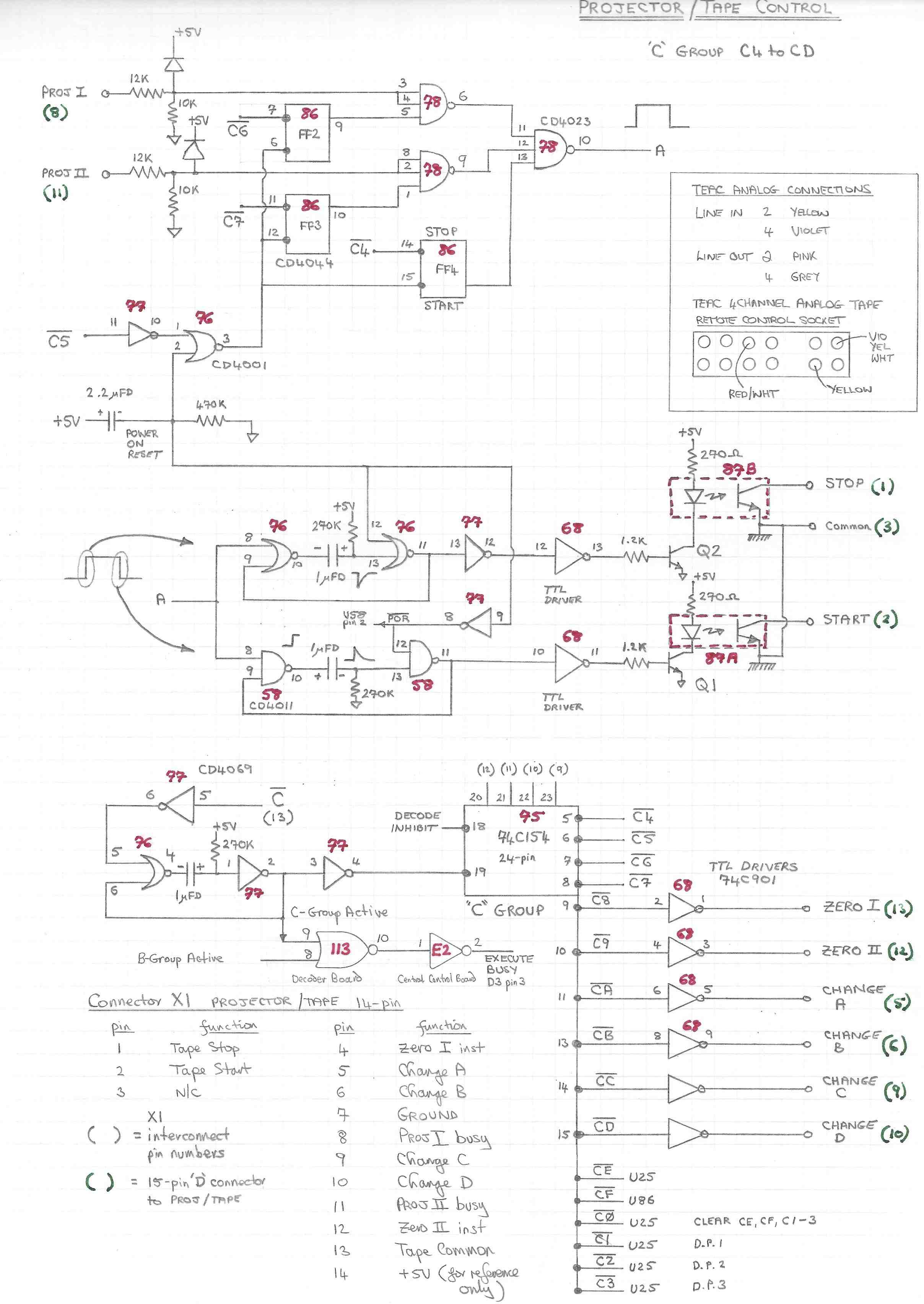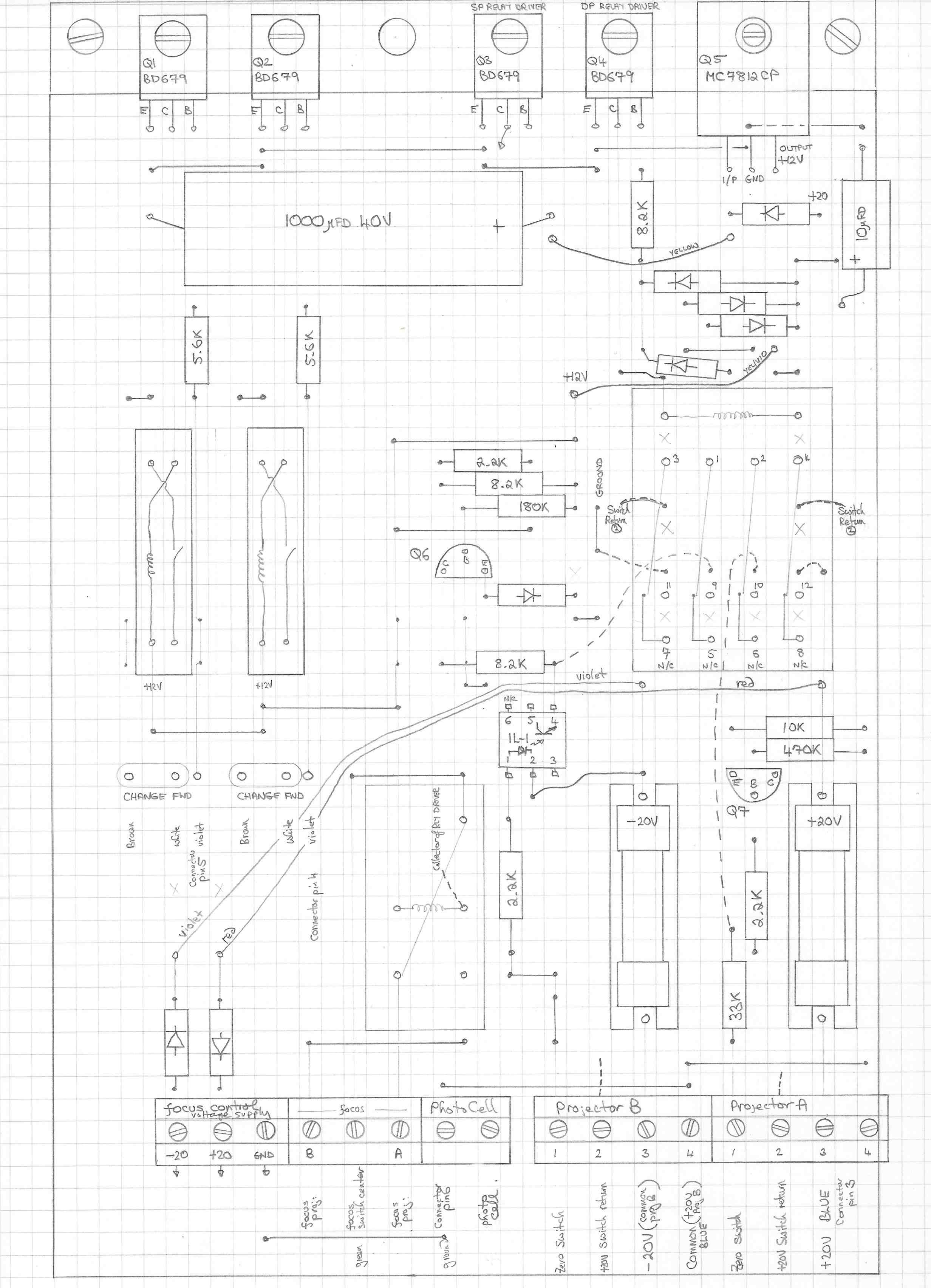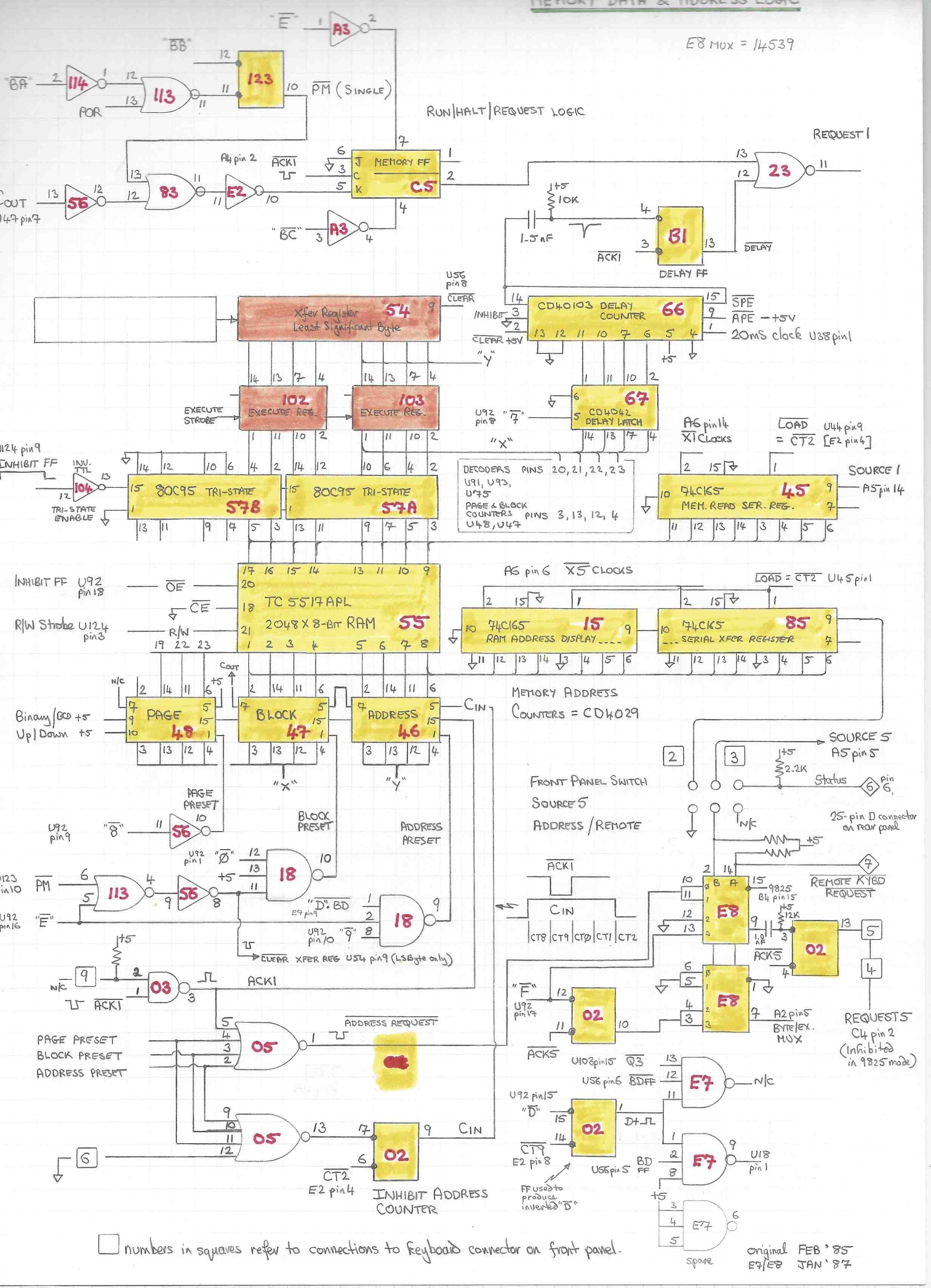 Detailed circuit diagrams and physical layout of components (central control unit) all hand-drawn between 1982 and 1987:
