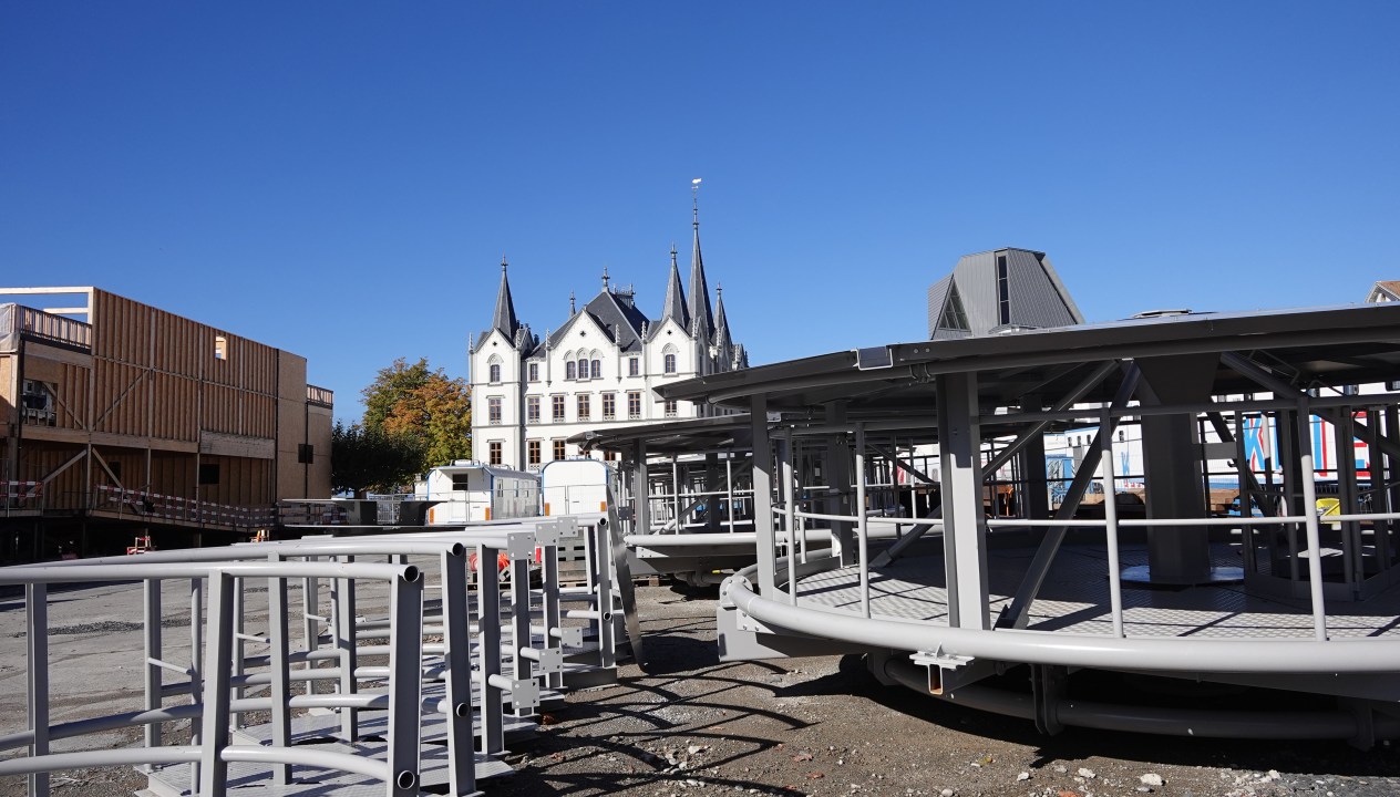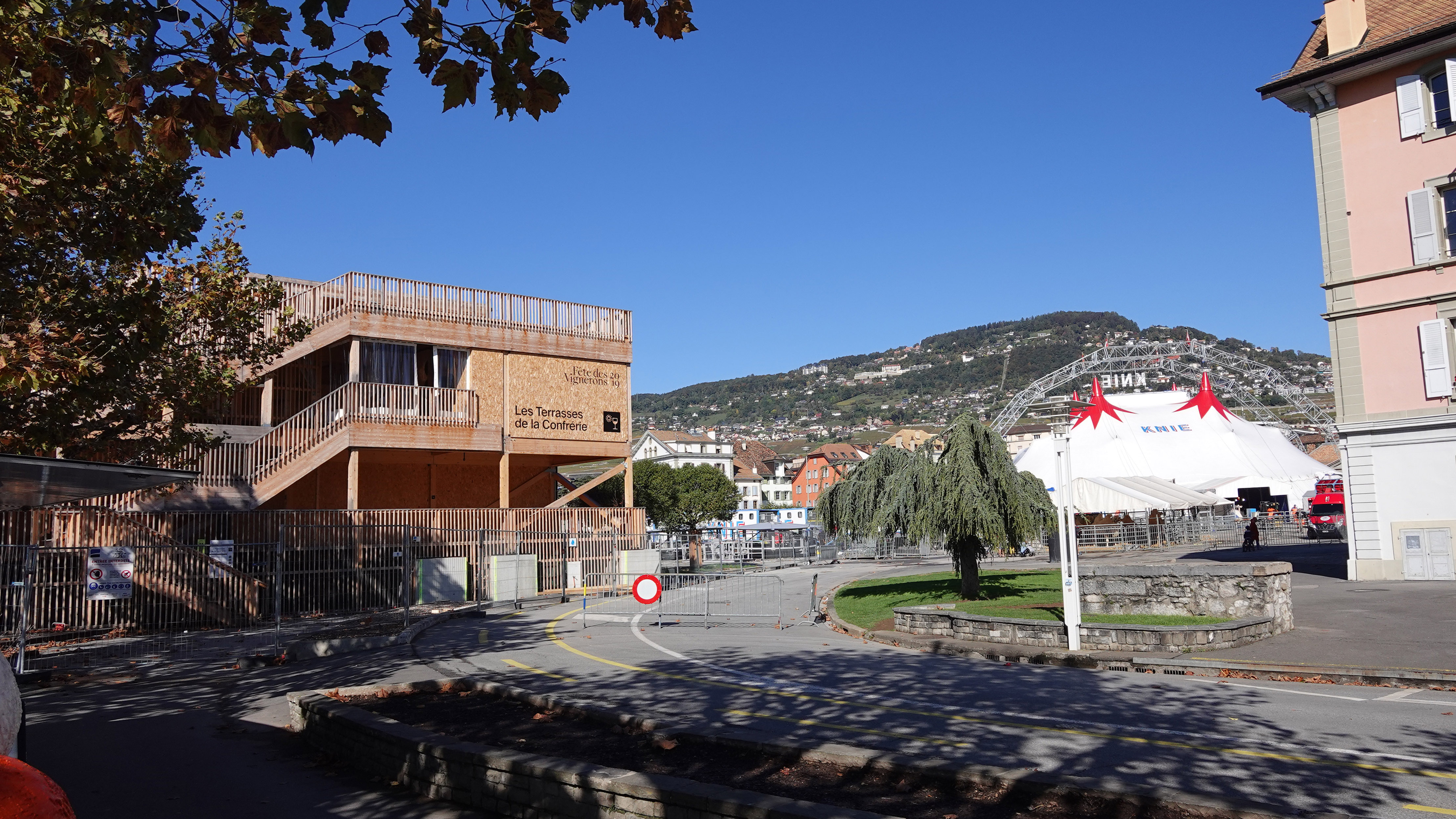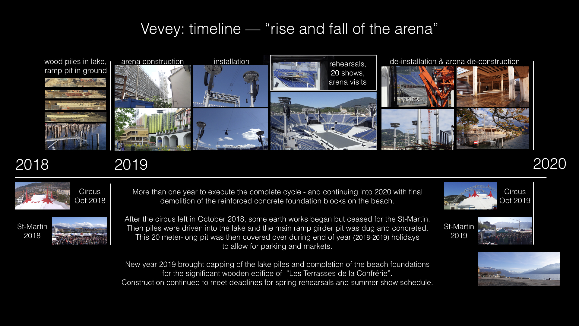 Panel one (1) is of the ambience in Vevey, around the arena, during Thurgovie and Appenzeler days. It serves also as a teaser for some of the arena’s technical aspects which are forming the major focus of the developing documentary. Panel 2 (2) Arena visit with a just a bit behind the scenes to describe some elements of the arena’s technology. In panel 3 (3), our central stage ramp model gets integrated into an otherwise “live” video of the arena. Panel 4 (4) video shows taking down of one of the eight 30 meter high sound masts. Panel 5 (5) is a place-holder for more arena deconstruction. The sixth video (6) tracks removal of the lake piles and the deconstruction of the lake walkway and the “Terrasses de la Confrérie” which the pillars supported.