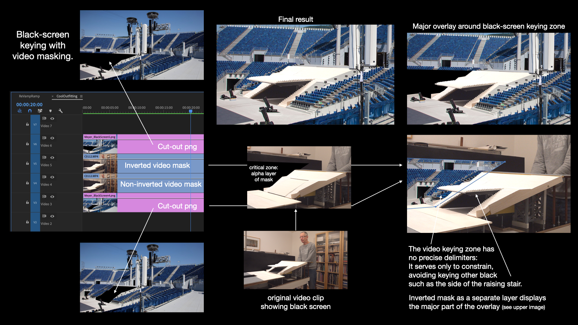 The video keying zone has no precise delimiters: It serves only to constrain, avoiding keying other black such as the side of the raising stair. Inverted mask as separate layers allow to display the critical keyed part of the background as well as the non-keyed portion.