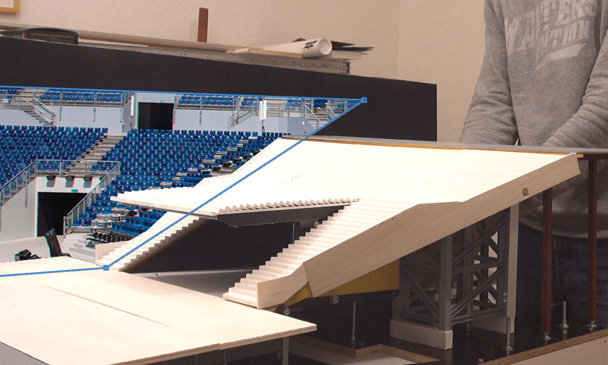 At this moment in time, it is interesting to look back at our colour-keying experience, of the ‘green screen’ era, and then experimenting with other colours of screen, including very positive results from a white wall. At that time we did not think about a ‘black screen’, however, with high-contrast situations, as with our mostly white raising stairways, we are pushing the idea a bit further, and it has worked. (See our 2013 post about those earlier tests.)