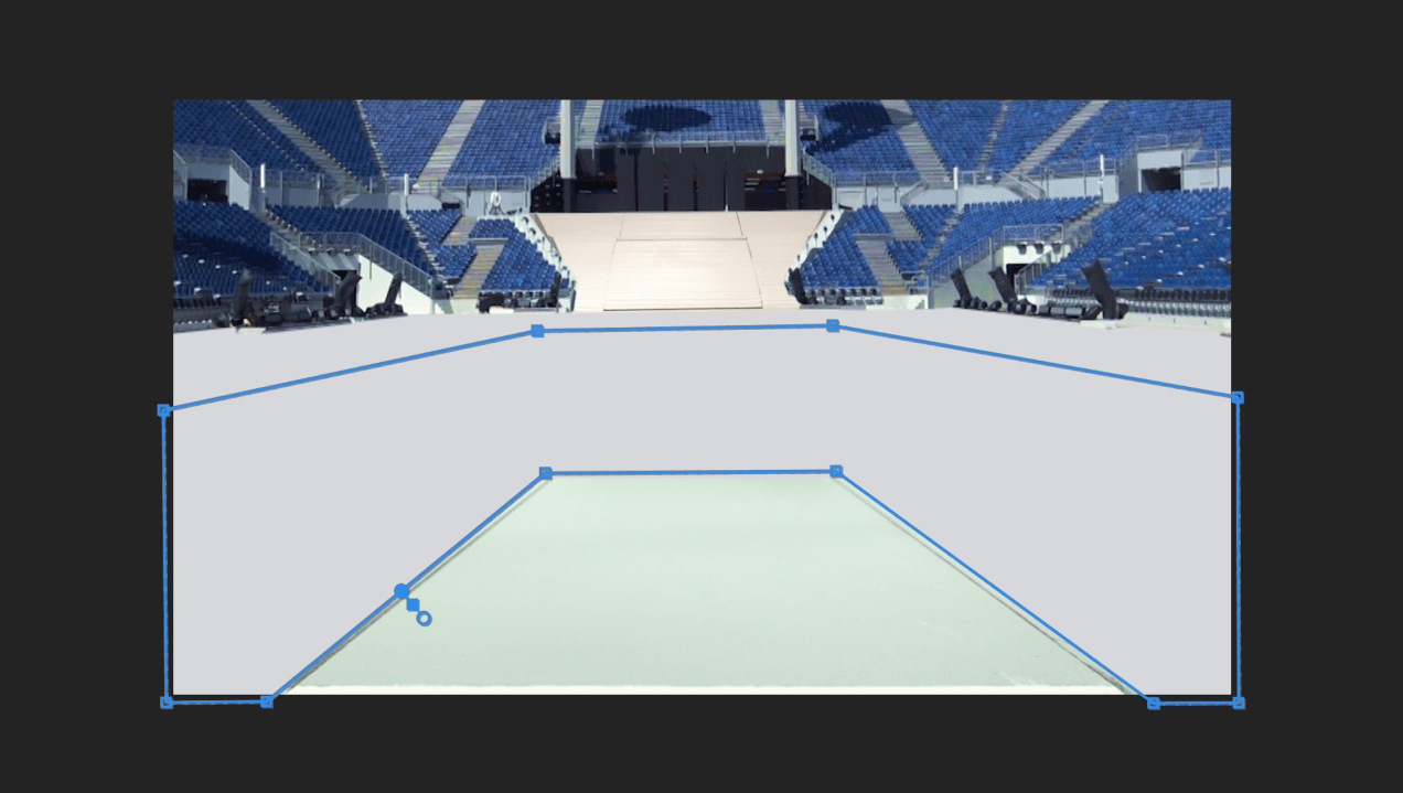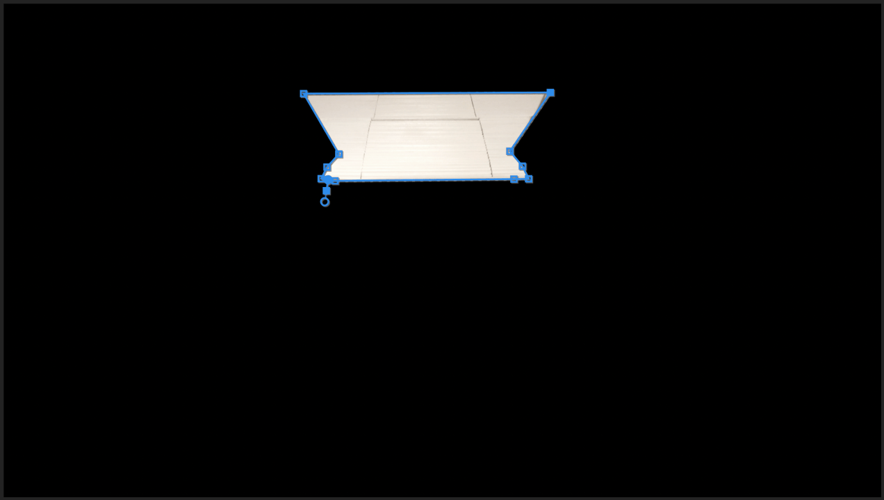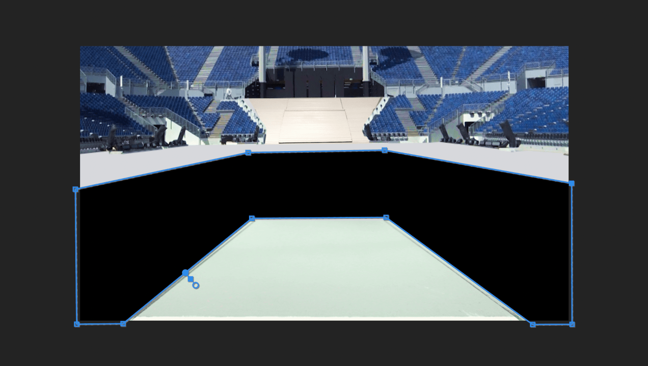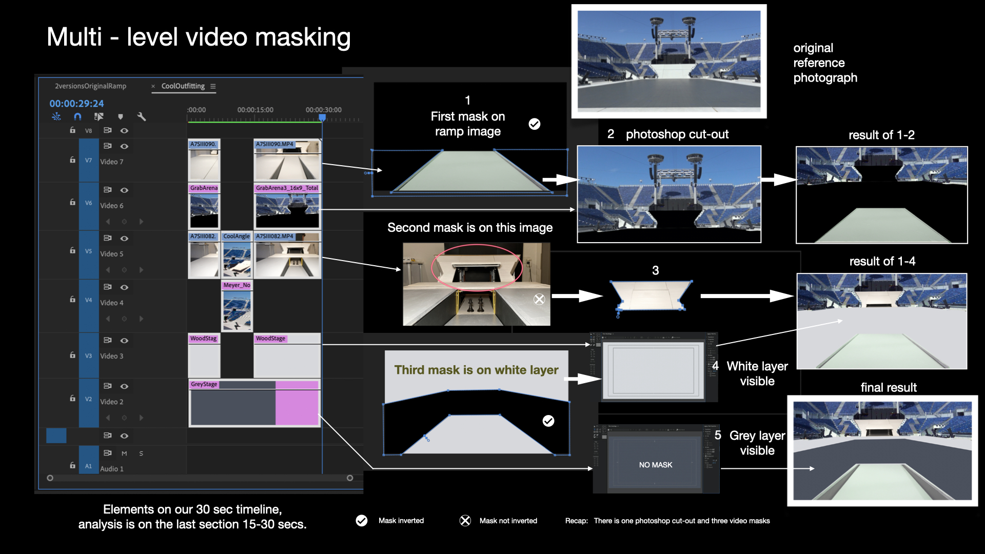 Here is a first graphic presentation and explanation to accompany the last 15 seconds of this working example. There was going to be a separate description of creating a tracking mask necessary for items which move over existing background, such as the angled view of the raising stair at 7-15 seconds in this clip. However, this method proved to be very time-consuming and frustrating with the saw-tooth shape of the stairway — it produced unclean results and was abandoned the moment we tested a method based on a combination of colour keying and less critical video masking. Results are described and shown in ‘black screen & mask‘.