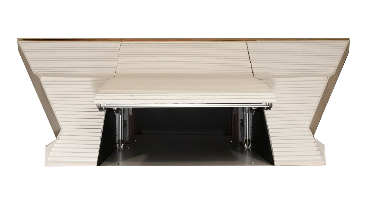 The whole exercise of integration is much simpler when the moving part moves over another part of the model (such as the raising stair moving over the fixed stair) or in front of a black background (as for the raising stair when it opens completely). An alternative technique would be to have the moving element move in front of a photograph as a printed background or displayed on a screen (similar to techniques used in ‘time warp‘ from 2008 and 2018).