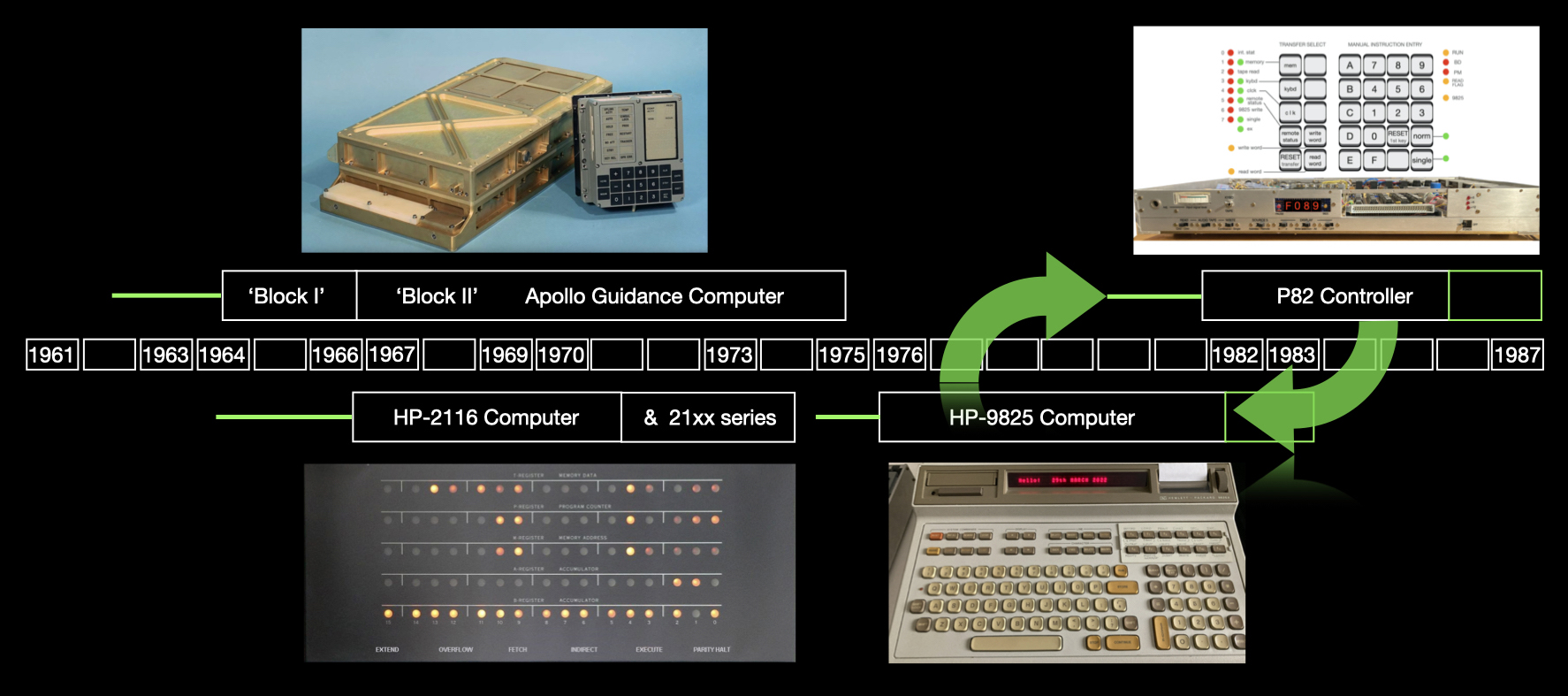 Moon landing computer technology and beyond – differences and similarities of two 1960’s developments and of our own 1980’s P82: